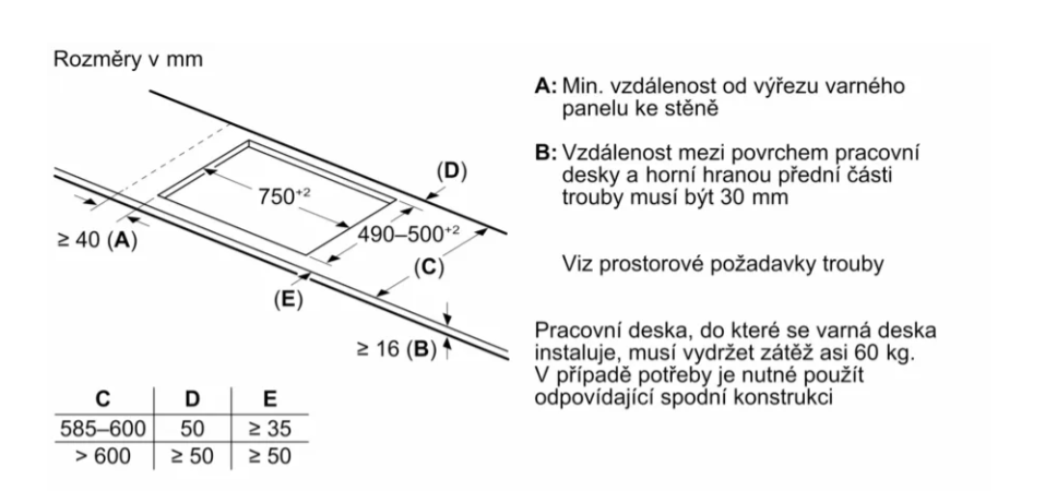 Požadovaná velikost otvoru pro instalaci (v x š x h)